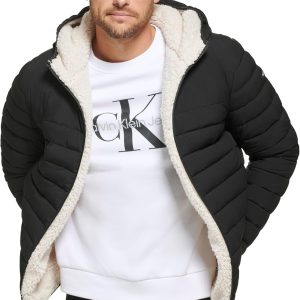 Men’s Hooded Down Jacket, Quilted Coat, Sherpa Lined, Ebony, Large